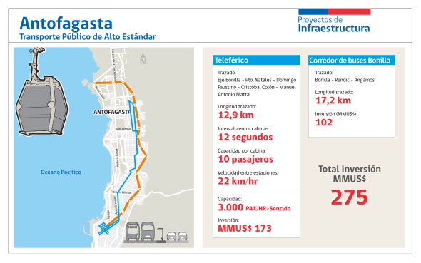 El trazado preliminar del Telef茅rico estar铆a dado por las calles Bonilla 鈥 Puerto Natales 鈥 Domingo Faustino 鈥 Crist贸bal Col贸n 鈥 Manuel Antonio Matta, con una extensi贸n de 13 kms. Por su parte, el corredor de buses ir铆a por Bonilla 鈥 Rendic, continuando hacia el sur por calle Angamos, con una longitud de聽 17,2 kms.